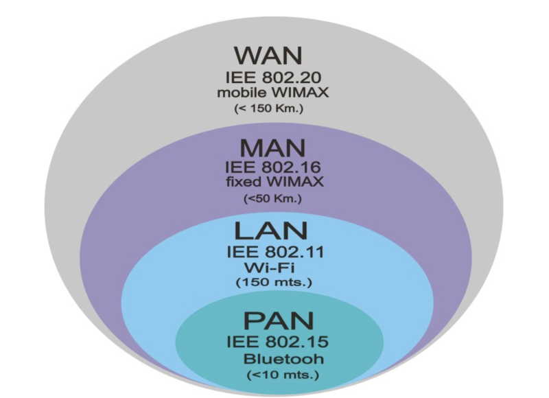 - PAN(Personal Area Network): 개인적인 네트워크 영역을 의미한다. 주로 블루투스 기술을 위해 사용된다. 30피트(약 9m) 이하에 사용되도록 제한된다. 마우스나 키보드 연결 등에 사용이 된다.