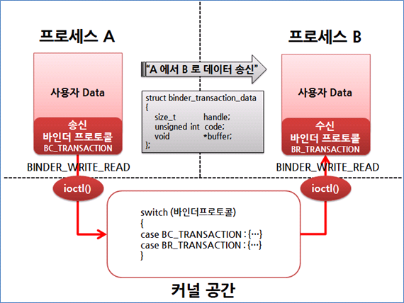 바인더 메커니즘의 아이디어는 "모든 프로세스가 공유할 수 있는 영역에 요청 내용과 응답 내용을 쓰고, 각 프로세스가 그 메모리 주소를 참조하게 하자"입니다. 이를 위해 커널 공간이 사용됩니다.